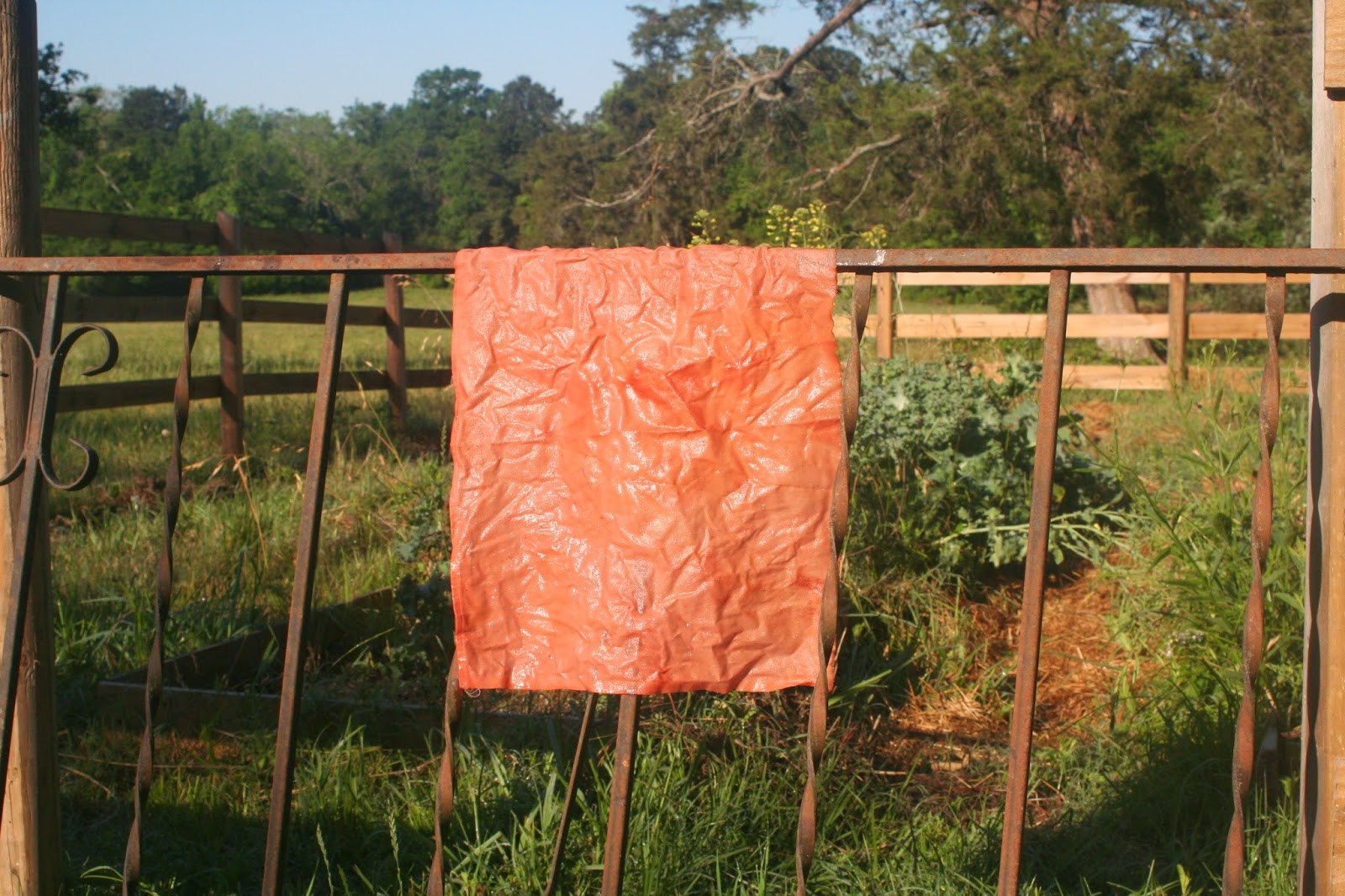 I took the now dyed fabric and carefully draped it across the garden gate.